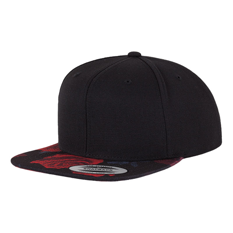 Rapper-style Cap, classic snapback shape. Has an image of red roses printed on the visor. Under visor is Black. Branding can be applied via embroidery or screen printing. 80% Acrylic, 20% Wool. Available only in Black.