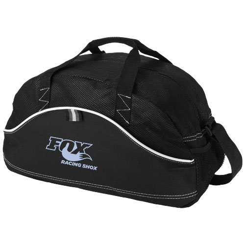 Boomerang duffel bag. Main zipped compartment. Front main pocket and pen loop. Side mesh water bottle pocket. Permanent, adjustable shoulder strap. 600D Polyester and non woven 80 g/m² polypropylene.