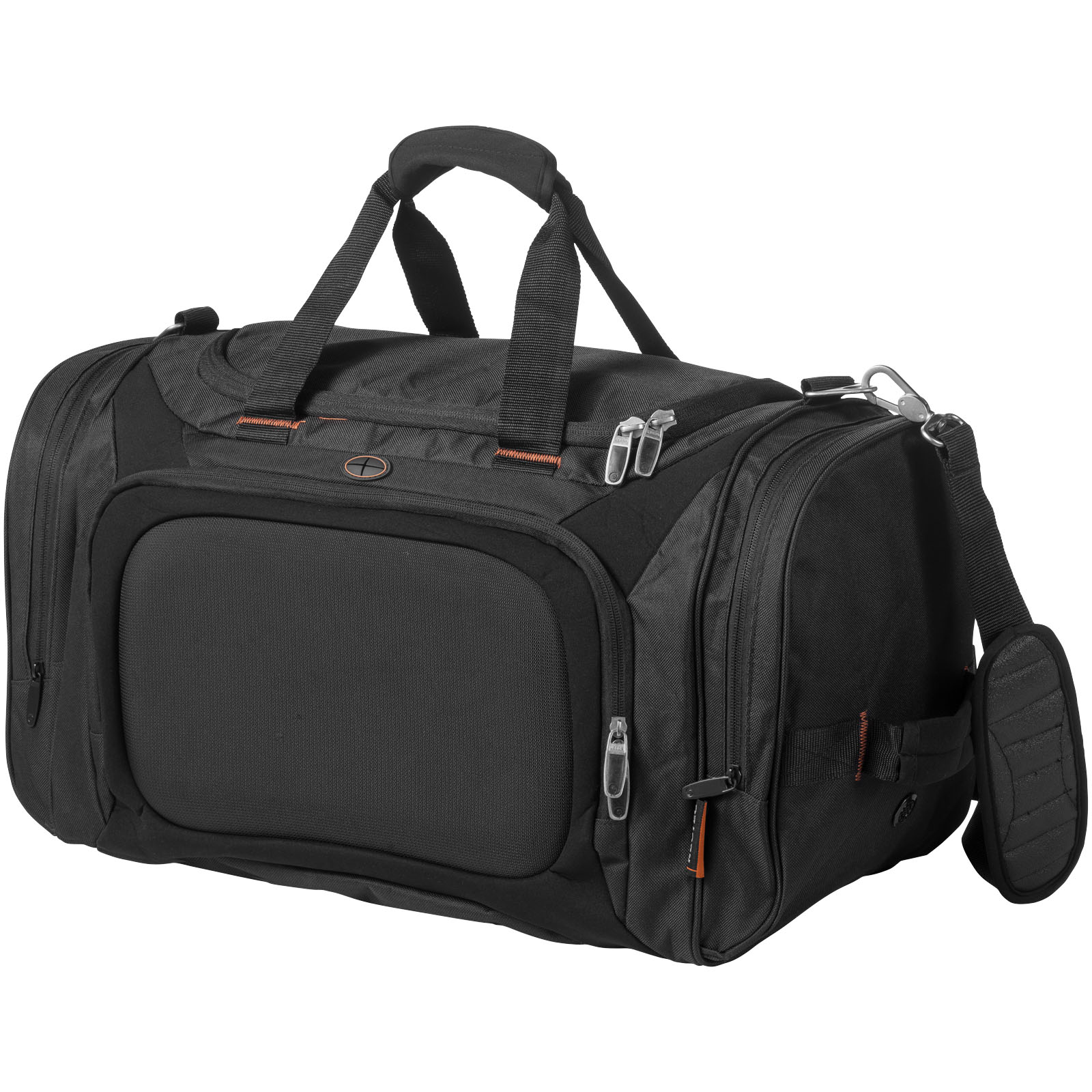 Neotec duffel bag. Large zipped main compartment. One vented side pocket with separate zipped shoe compartment. One vented side wet pocket. zipped hard EVA sLight pocket to protect small electronics. Adjustable and padded shoulder strap and handles. Packed in an Avenue gift pouch. 600D Polyester.
