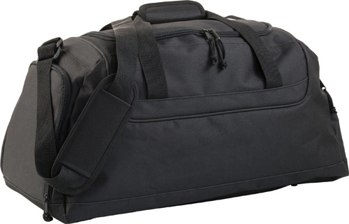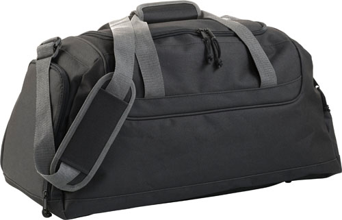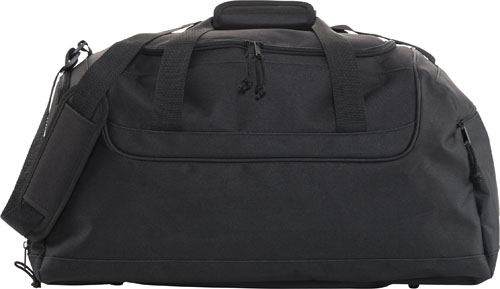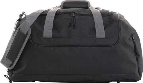Polyester (600D) travel bag with one large zipped compartment, two zipped pockets on either side, one especially for wet items, with two carry handles, and one adjustable carry strap This sportsbag is also available with grey handles
