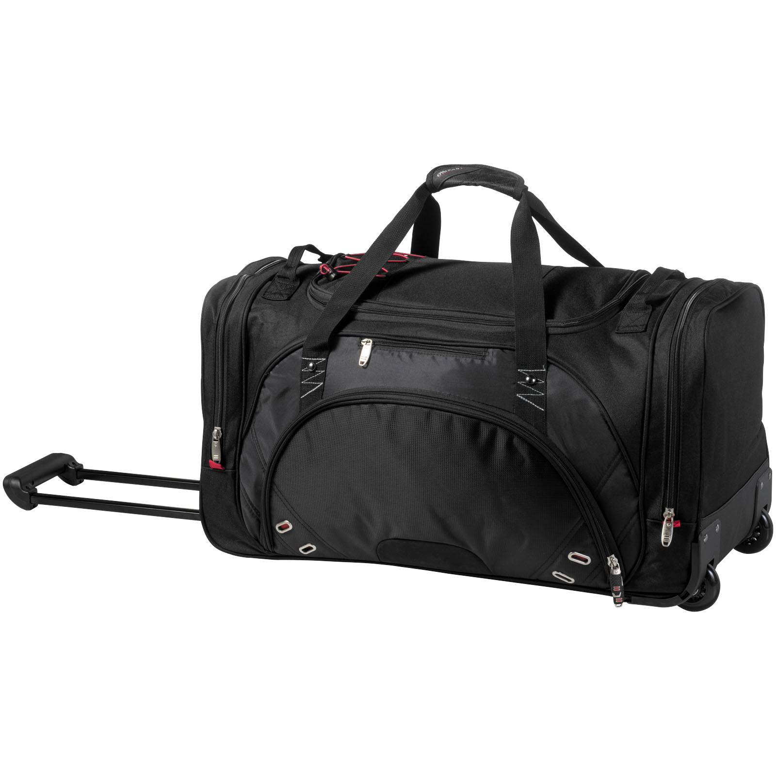Proton wheeled duffel bag. Zipped main compartment with U-shaped opening. Front top nylex-lined media pocket. Large zipped front pocket includes removable tech-trap organiser panel and pocket organization. Two large gusseted pockets include an extended interior shoe pocket. Additional exterior side zipped pocket. Elastic shock cord on top panel for maximum storage. ID window on back. Recessed, telescoping handle and inline skate wheels with corner protectors. Moulded side grab handle with neoprene padding, two top webbed grab handles, and main handles made of durable webbing with a comfortable handle wrap. Signature elleven lining and hardware. Dobby nylon and scuba. 2950.