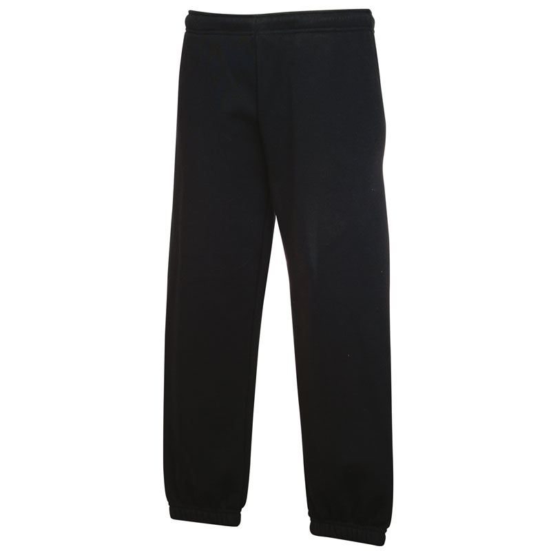 Cotton rich fleece in 70% cotton, 30% polyester, restyled front and back rise differential for a better fit, elasticated cuffs and waist with matching coloured draw cord, no outside leg seam for maximum printability, side pockets
