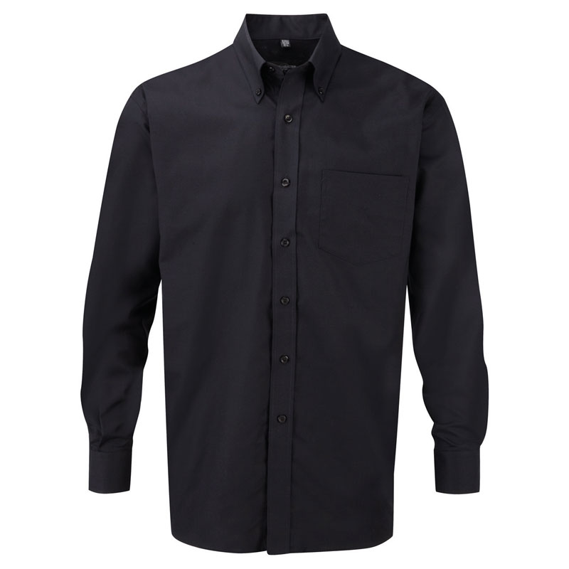 "Long sleeve easy care oxford shirt, 70% cotton, 30% polyester oxford shirt, true easy care fabric requires minimal ironing, button down boned collar, back yoke with 2 side pleats, Single pocket over left chest, rounded 2 button adjustable cuffs plus single button on cuff gauntlet.