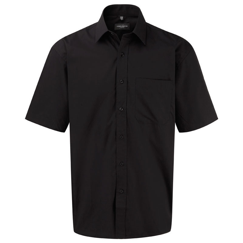 "Smart shirt in classic 100% cotton poplin fabric, True easy care fabric requires minimal ironing, 7 button placket with matching colour buttons, Stiffened, Kent-style boned collar, Single pocket over left chest, Short Sleeves