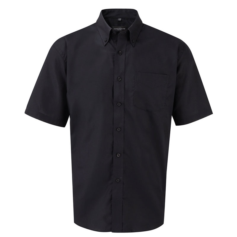 "70% cotton/ 30% polyester oxford shirt, True easy care fabric requires minimal ironing, Button down boned collar, Back yoke with 2 side pleats, Single pocket over left chest, Short Sleeves