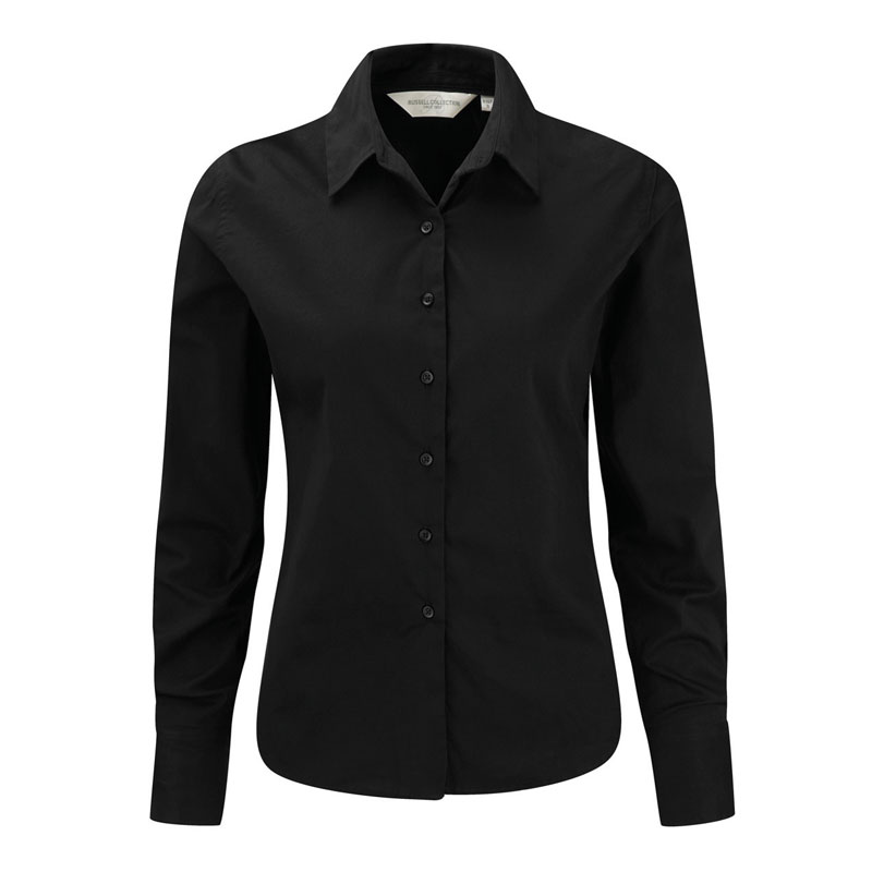 Stylish promotional womens long-sleeved twill Blouse. 100% Cotton Twill, classic casual shirt, soft to the touch fabric, relaxed collar, dye-to-match herringbone tape along neck seam, shaped at the waist for a more feminine silhouette, fabric patch tab on back yoke and side seam hem, rounded edge cuff with two buttons, curved hem. Weight: 130g/m².