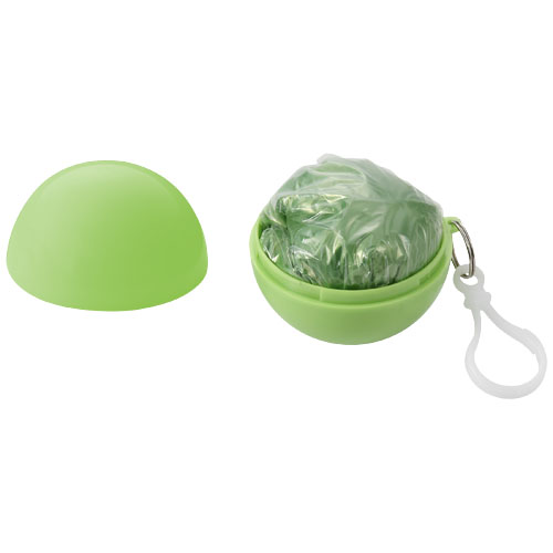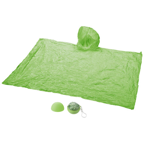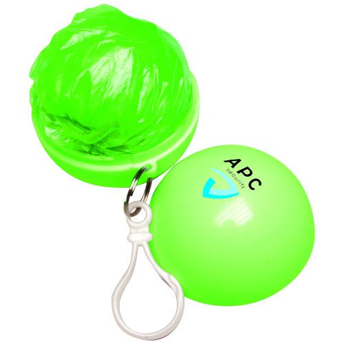 Rain poncho. One-size-fits-all hooded poncho (90x120 cm.) for unexpected downpours. Conveniently compact container hooks onto a keychain, fits into a small pocket and is a great add-on to any bag or drinkware piece. Decoration on container only. PS plastic.