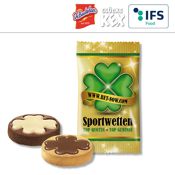 Cripsy biscuit with milk cream filling and a clover leaf of tender-melting chocolate, individually packed in a transparent or shiny white bag. Cookies may crumble during packaging.