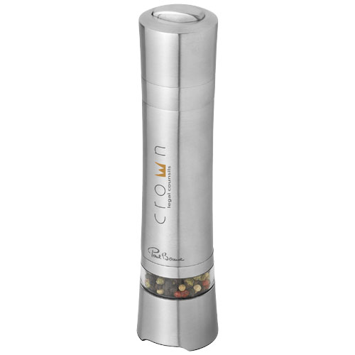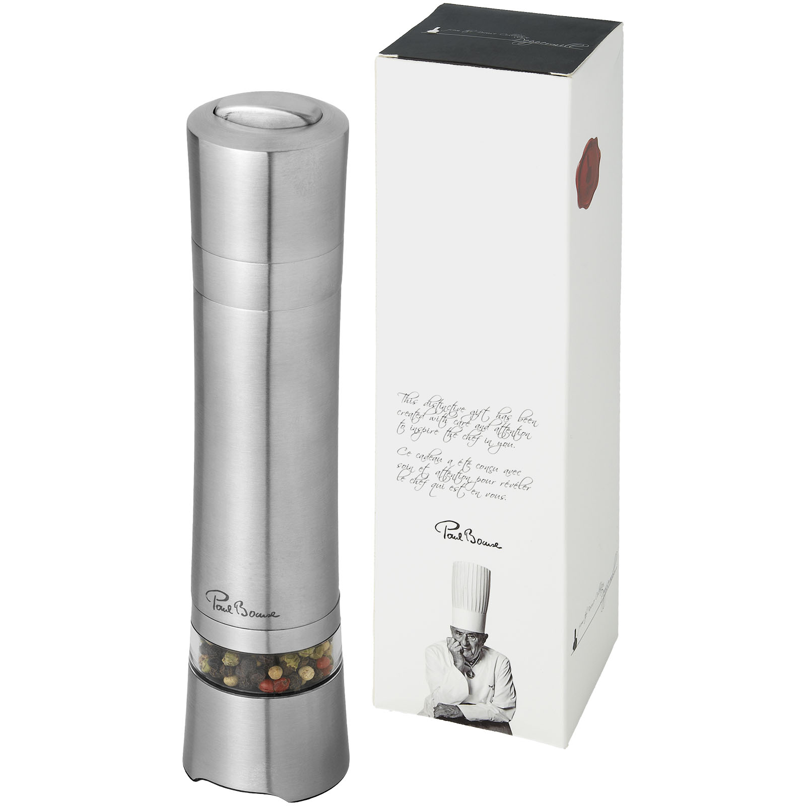 Solo electric pepper mill. Automatic pepper mill with ceramic grinder. Peppercorn and batteries are not included. Pepper mill operates on 6 x AAA batteries. Presented in a Paul Bocuse gift box. Exclusive design. Stainless steel.