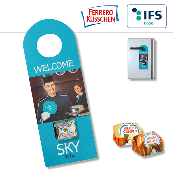 Promo Door-Tag, content sticked to the front. Through handy perforation also suitable for car rear mirrors. Please take note of Ferrero's annual summer break.