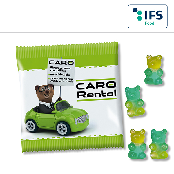 Fruit gum bears with the fancy taste of sweet-sour grapefruit and refreshing mint, bicoloured: mint/yellow, packed in a transparent or shiny white bag.