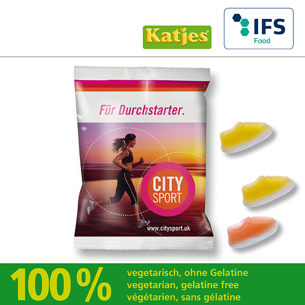 Fruit gum with foam sugar without animal gelatin and 20% dextrose, no artificial colouring or flavours, in a variety of colours and flavours, packed in a transparent or shiny white bag.