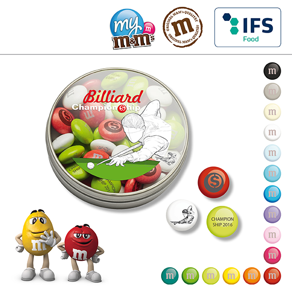My M&M‘s chocolate lentils individually designed according to your specifications on lentil colours and printed advertising message, packed into a refillable matt silver metal tin with clear cover, sleeved with a red tear strip.