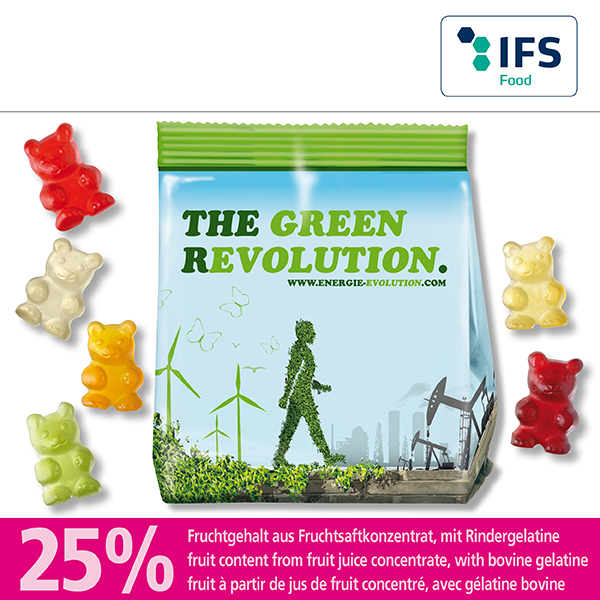 Fruit gum bears with 25 % fruit content from fruit juice concentrate and with beef gelatin, in a variety of colours and flavours (orange, apple, passionfruit, strawberry, blackcurrant and peach), packed in a transparent or shiny white stand-up pouch.