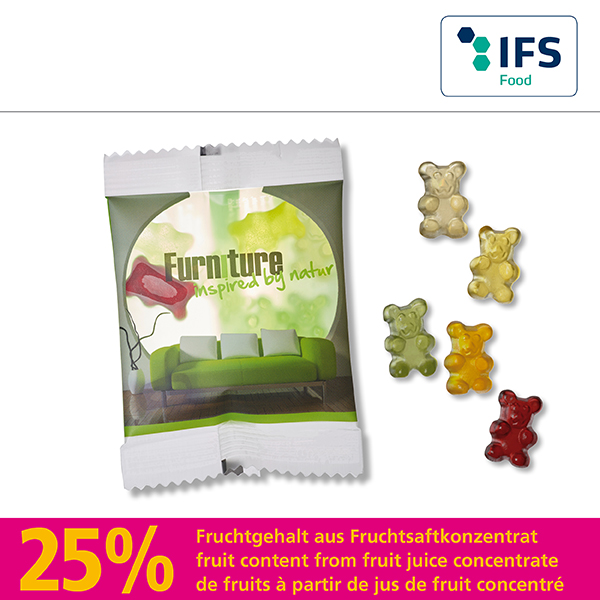 Fruit juice gum bears with 25 % fruit content from fruit juice concentrate, natural aroma and colouring plant extracts in a variety of colours and flavours, packed in a transparent or shiny white bag. Alternatively packed in a matt-coated bag.