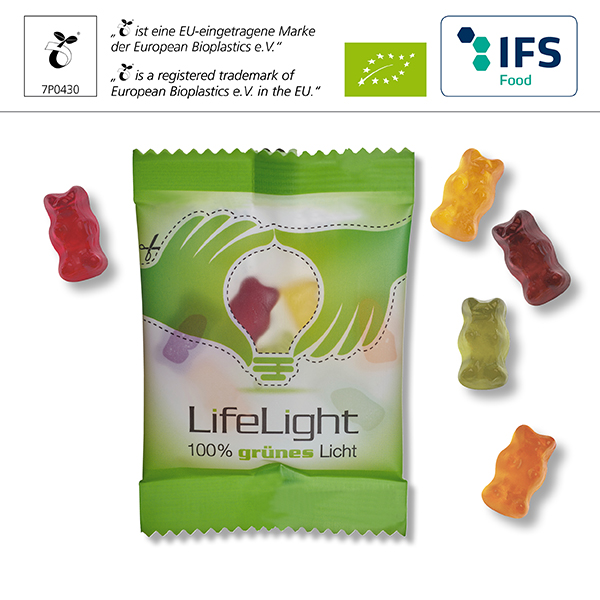 Organic fruit gum bears* from certified organic ingredients in a variety of colours and flavours, packed in a transparent or shiny white compostable bag.From 320 kg all standard shapes are possible. * BIO certified: DE-ÖKO-007