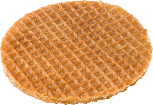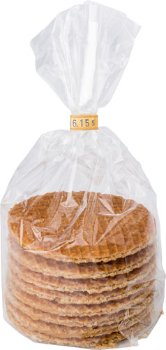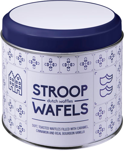 Eight delicious Dutch waffles with a caramel-like syrup filling in the middle, packed in a plastic bag and can with Dutch pattern, with a white lid for printing purposes Starting from the production day, the expiration date is approx 39 weeks