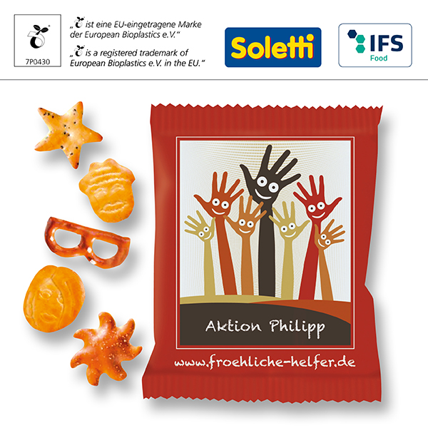 Assortment of salty snacks and crackers in a variety of shapes such as moon and stars, hearts and funny glasses, sun and smiley faces, packed in aluminium foil or