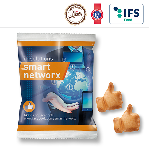 Butter shortbread in shape of the Facebook like-symbol, light brown baked packed in a transparent or shiny white bag. Cookies may crumble during packaging.
