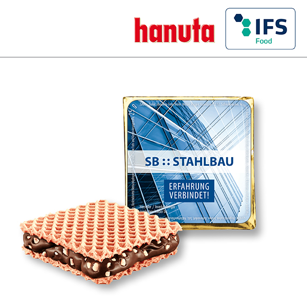 hanuta hazelnut chocolate bar from Ferrero, square, wrapped in golden aluminium foil, the original hanuta label on one side, other side to be personalised.