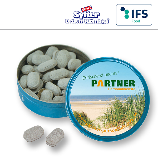 High quality aroma preserving tin, round, refillable, printing area on the lid is white. Bottom surface and rim are in “Echt Sylter Brisen-Klömbjes“ design (German only).