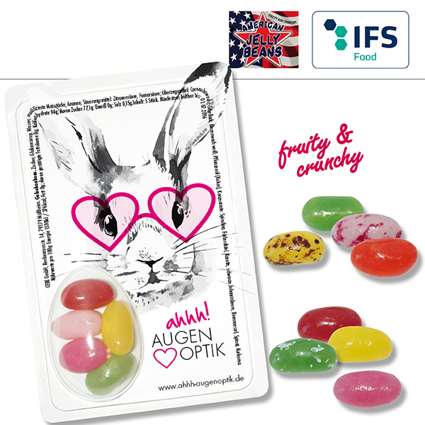 Little bean-shaped drages, mixed flavours: pineapple, banana, pear, blueberry, blackberry, cola, strawberry, raspberry, cherry, kiwi, orange, peach, strawberry-cheesecake, vanilla and lemon packed in a blister pack made from deep-drawn plastic foil on a card, covering paper white.