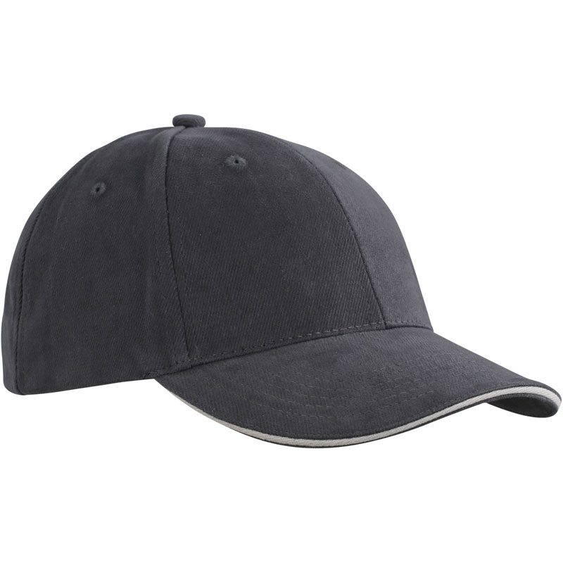 Sandwich cap in a multitude of colour combinations, 100 * super heavy brushed cotton, 6 embroidered ventilation holes, 6 stitched lines on the peak, front panel laminated. Padded band satin sweat. Maximum surface for ennoblement on front panel approx. 5 x 10 cm (we recommend the ennoblement by embroidery. Screen printing is not practicable based on the centre seam).