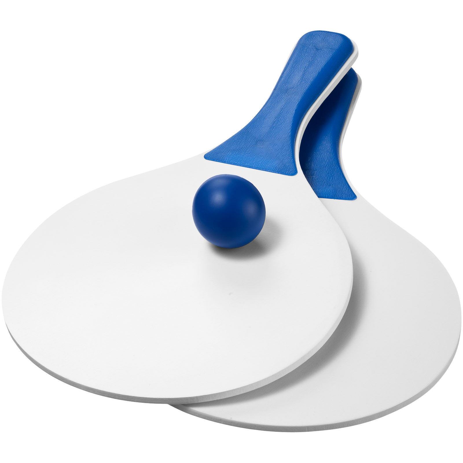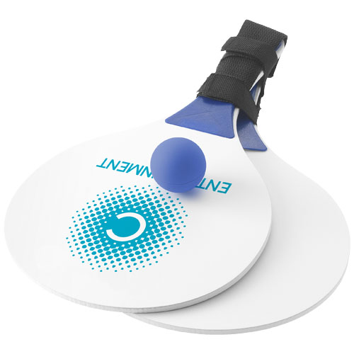 Matira Beach Bat & Ball set. Including 2 bats and 1 small rubber ball. The bats are made out of wood and have differently-coloured wooden grips on the handles.