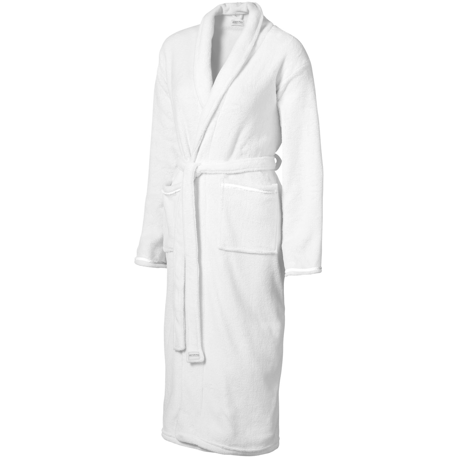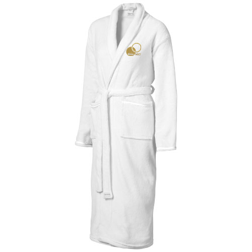 Comfy promotional Bloomington ladies' Bathrobe. Super soft with cotton tape details on both pockets. Shawl collar, locker loop and self fabric belt. Presented in a Seasons gift pouch. Exclusive design. Coral fleece of 100% Polyester 245 g/m². Perfect for corporate spa retreats.