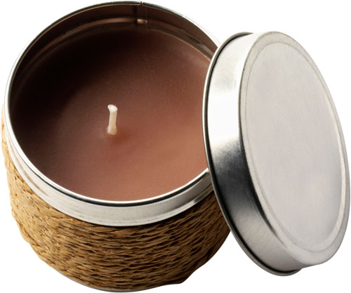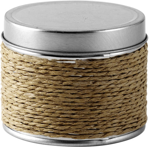 Fragranced candle contained in a tin with twine wrapped around it. Available in a selection of aromas of vanilla, coffee or cinnamon. Branding available via laser engraving on the lid.
