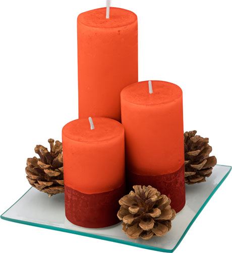 Set of three pilar candles in different sizes: 5x7,5 cms, 5x10 cms and 5x15 cms, including a clear glass plate and three decorative pine cones; presented in a colourful gift box