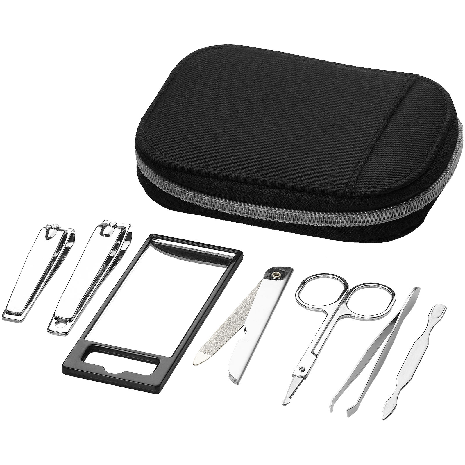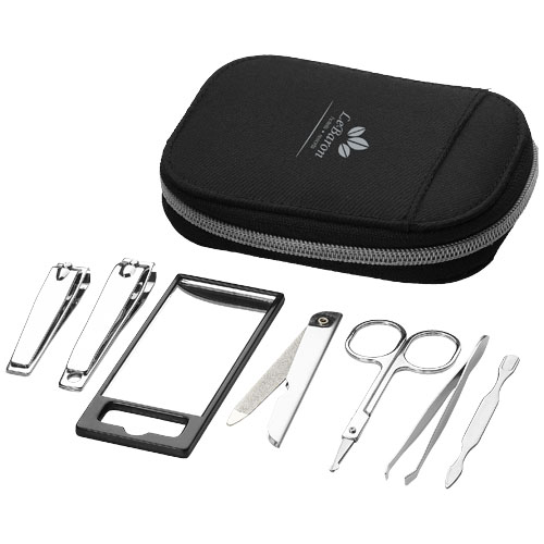 Merchandising in beauty-care. Christel 7-piece personal care kit. Make sure you always look your best. This set includes a mirror, tweezers, a nail clipper, a toe nail clipper, a pair of scissors, a nail file and a cuticle tool. The set comes in a handy nylon pouch. Microfibre nylon. Default branding available on the pouch, but more individual requests are possible upon consultation.