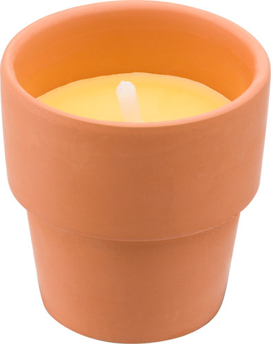 Citronella candle encased in a terracotta pot. Perfect promotional item for outdoor summer events. Keep those mosquitos away!