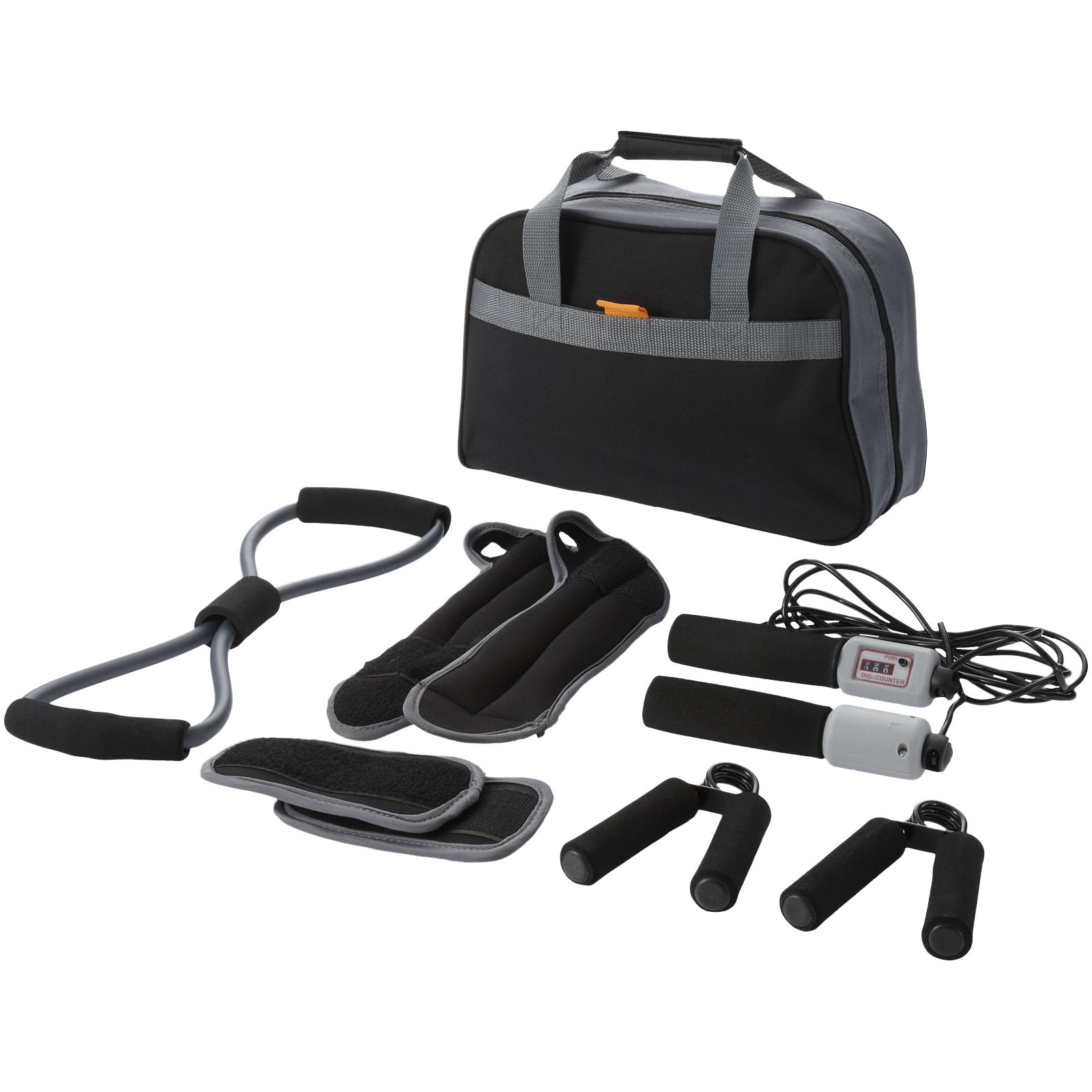 Inclusive promotional Go4it Fitness Kit. 9-piece set includes zipped case with front pocket including hand grips, ankle weights, regular weights, an exercise band and a skipping rope with counter function. 600D polyester. STRENGTHEN your brand identity with this kit!