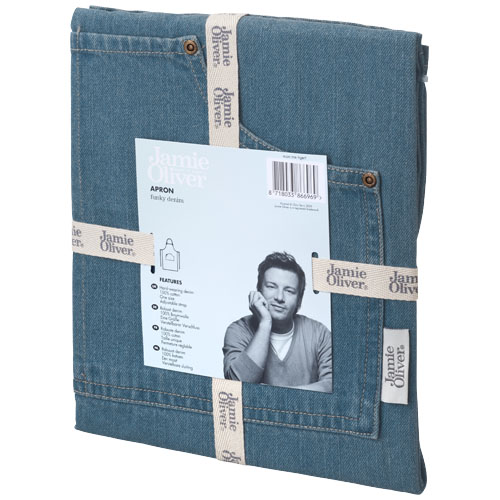 Apron. The original Jamie Oliver apron. One size fits all with adjustable strap, funky rivets and buttons and multiple front pockets. Supplied in Jamie Oliver packaging. Exclusive design. Denim.
