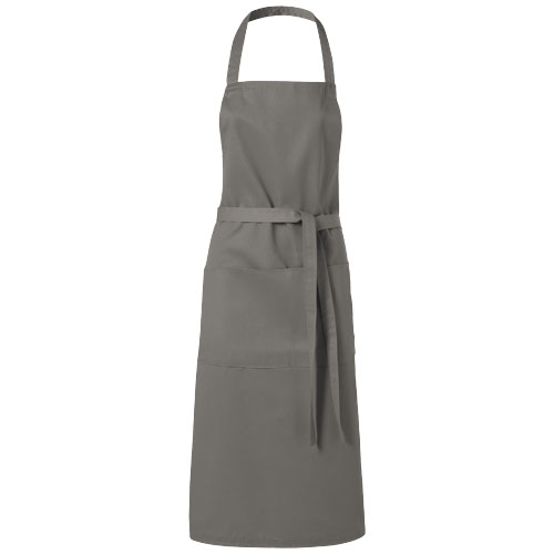A logo printed on the promotional Viera Apron. The twill fabric apron with 2 pockets and 1m tie back closure. Twill fabric of 65% polyester and 35% cotton.
