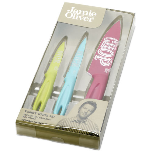 Funky Knife Set. Set includes 15cm chef's knife, 11cm serrated knife and 8.5cm paring knife. Durable non-stick coating, dishwasher safe. Supplied in a Jamie Oliver gift box. Exclusive design. Stainless steel.