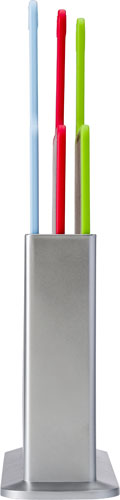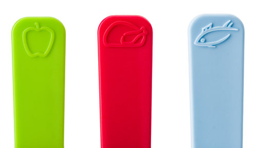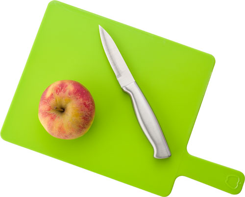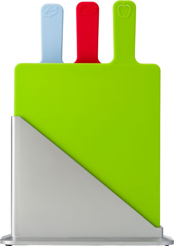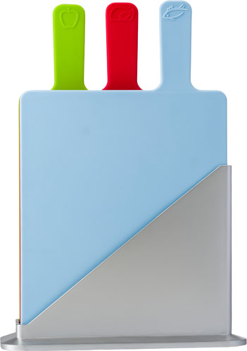 3-piece ABS Cutting Board set in a silver coloured holder. Each cutting board is matched to a specific food group: blue is for fish and seafood, red is for poultry and meat, and green is for fruit and vegetables.