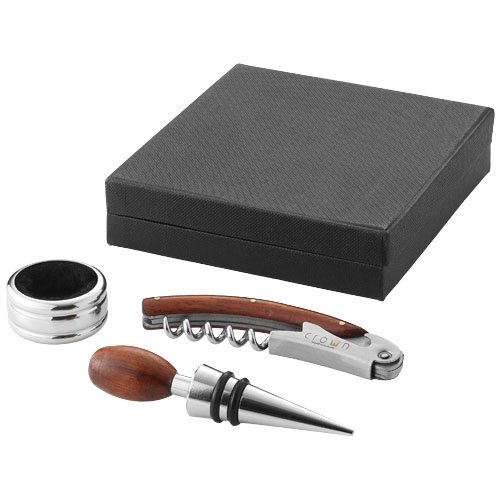 3-piece Wine Set by Valdi. Gift set with a drip stopper, Waiter's Friend and bottle stopper with wooden detail. Presented in a gift box. Exclusive design. Metal.