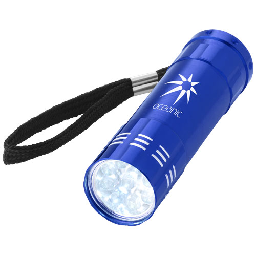 A company logo on the promotional Leonis Torch. The stylish bright white 9 LED torch with wrist strap and push button on/off power switch at the back. 3xAAA batteries required (NOT included). Aluminium.