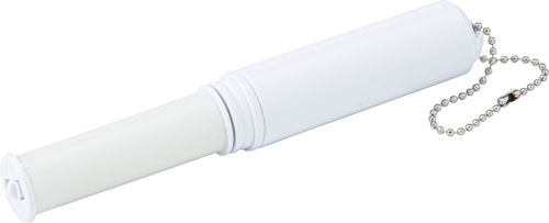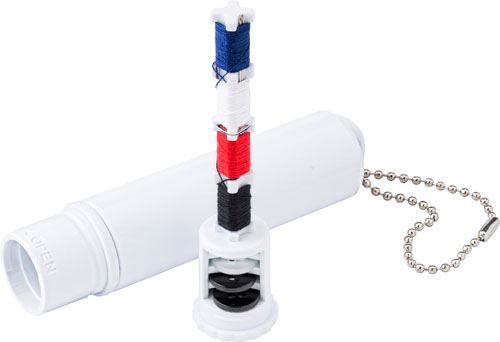 Plastic clothes brush with integrated sewing kit in the handle, the kit includes two needles, thread in the colours blue, white, red, and black, and two white and two black buttons, includes a chain on the cap