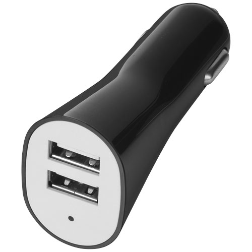 Pole dual car adapter. Dual plug adapter. Plug into power outlet to charge personal devices. USB output: 5 Volts / 2.0 Amps. Input: 12V-24V. Suitable for cars and trucks. ABS plastic.