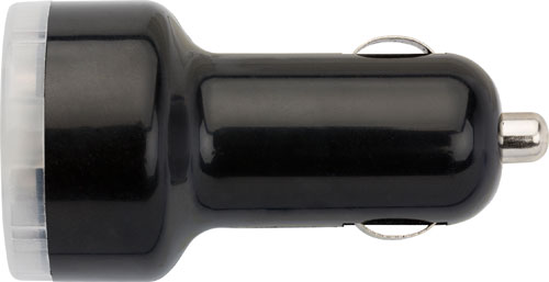 Simple and solid promotional Plastic Car Power Adapter with Two USB Ports. The plugs into the car cigarette lighter jack to become a powered USB port, with an input of 12V, and an output of 5V/660mAh.